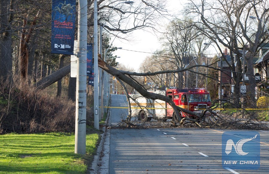 A tree falls down on the ground during the high wind weather in Toronto, Canada, May 4, 2018. (Xinhua/Zou Zheng)