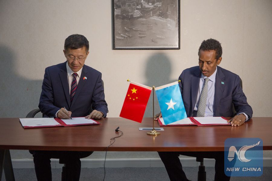 The Chinese government on May 14, 2018 donated 1.5 million U.S. dollars to assist Somalis affected by the raging floods. Photo shows Qin Jian (L), the Chinese Ambassador to Somalia and Ahmed Isse Awad (R), Somali Minister of foreign Affairs, signing an agreement.