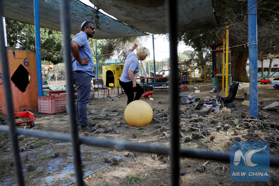 People stand in a kindergarten yard damaged by mortar shells fired from the Gaza Strip that landed near it, in a Kibbutz on the Israeli side of the Israeli-Gaza border, May 29, 2018. (Reuters photo)