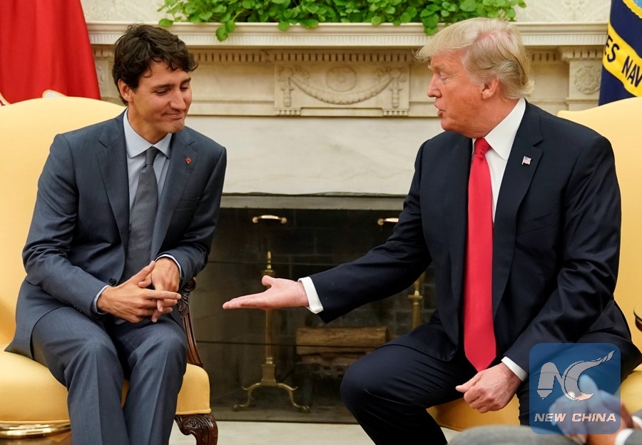 FILE PHOTO: U.S. President Donald Trump greets Canadian Prime Minister Justin Trudeau in the Oval Office at the White House in Washington, U.S., October 11 2017. (Xinhua/REUTERS)