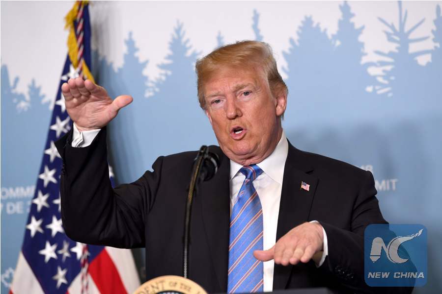 U.S. President Donald Trump speaks to reporters on June 9, 2018, during the G7 Summit in La Malbaie, Quebec, Canada. (Xinhua/AFP)