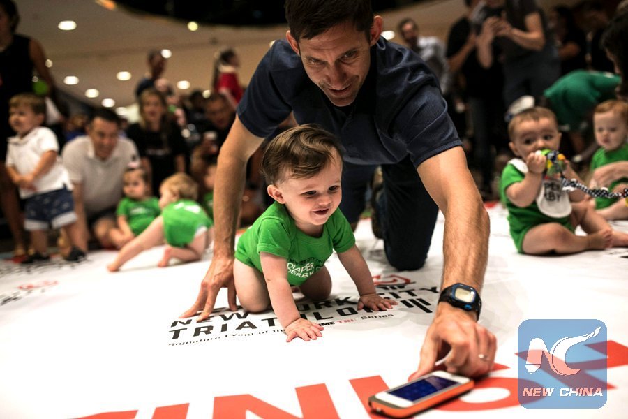 A father lures his child along with an iPhone during warmups before babies race in the NYC Triathlon's annual Diaper Derby, July 14, 2017, in New York City, the United States. (AFP Photo)