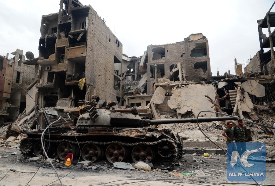Syrian soldiers are seen next to a tank in the largely destroyed Hajar al-Aswad district, south of Damascus, Syria, on May 22, 2018. (Xinhua/Ammar Safarjalani)