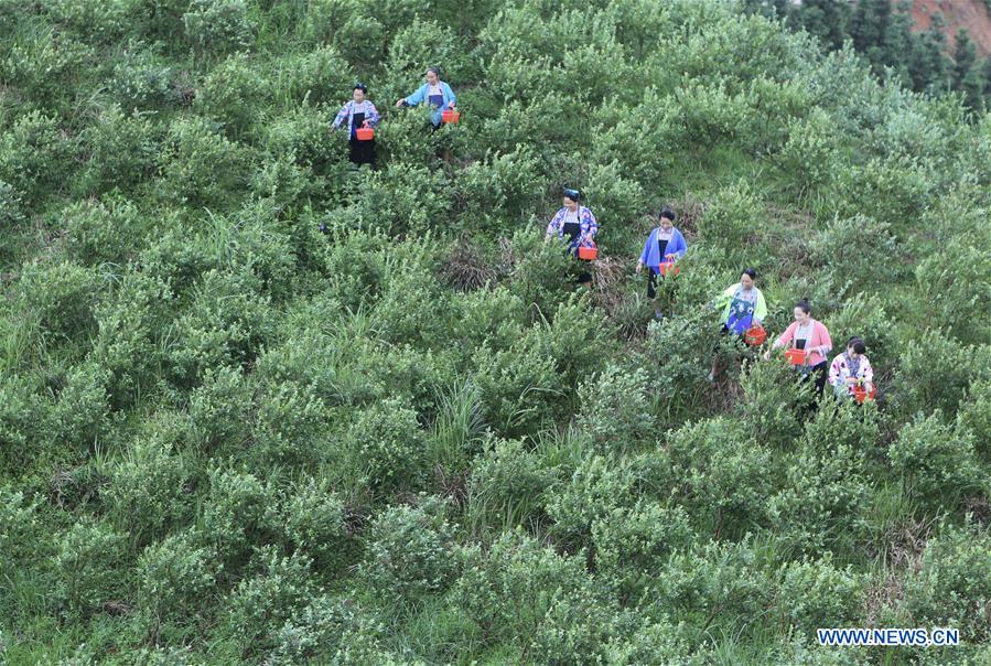 Villagers pick blueberries at a blueberry planting farm in Gaolan Village in Rongshui Miao Autonomous County, south China's Guangxi Zhuang Autonomous Region, June 23, 2018. In recent years, the village has encouraged poverty-stricken villagers to plant blueberry as a way to get rid of poverty. (Xinhua/Huang Xiaobang)