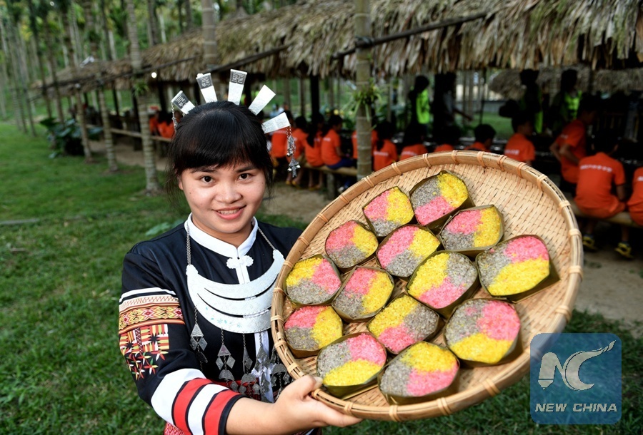 File Photo: A girl of Li ethnic group shows local snack of three-color rice in Xiaomei Village, Lingshui Li Autonomous County, south China's Hainan Province, Jan. 21, 2018. After local government's targeted measures in poverty alleviation work, the improved environment in Xiaomei Village, once an impoverished village, now attracts more tourism business for local people. (Xinhua/Zhao Yingquan)