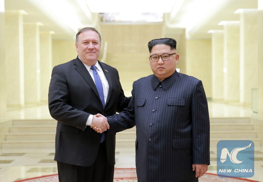 File Photo: Photo provided by the Korean Central News Agency (KCNA) on May 10, 2018 shows Kim Jong Un (R), top leader of the Democratic People's Republic of Korea (DPRK), shaking hands with visiting U.S. Secretary of State Mike Pompeo on May 9, 2018. (Xinhua/ KCNA)