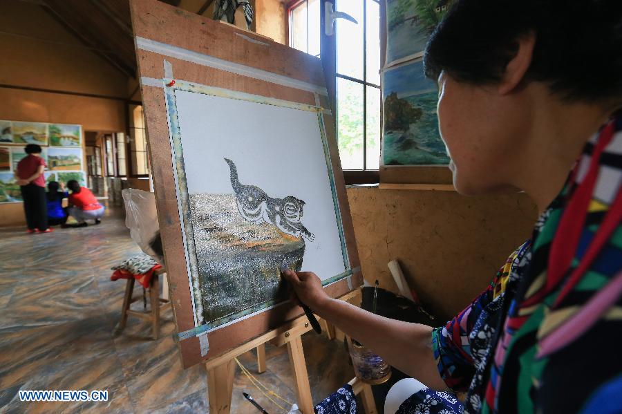 Wang Lizhen makes a painting in the Muyun'an community of Rongcheng City, east China'sShandong Province, July 5, 2018. The Muyun'an community is famous for painting and is dedicated to boosting tourism based on cultural heritages. (Xinhua/Wang Nan)