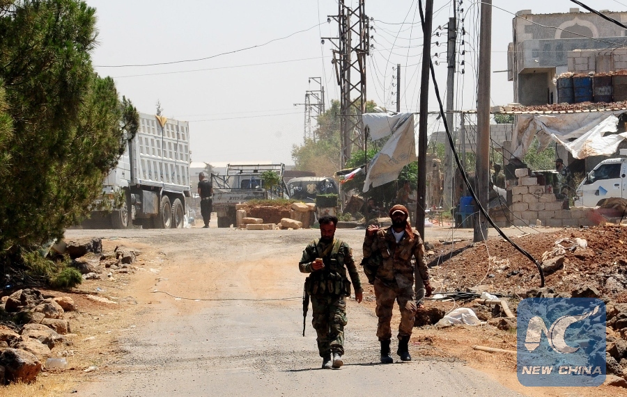 Syrian soldiers walk in the town of Saida, Daraa province, Syria, on July 5, 2018. The Syrian army on Thursday started an operation along the Syrian-Jordanian borderline in the countryside of the southern province of Daraa. (Xinhua/Ammar Safarjalani)