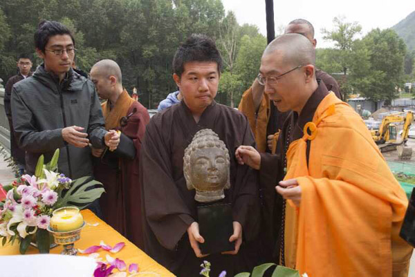 Thirty-five people showed fierce enthusiasm for the auction of a head from a Tang Dynasty-era (618-907) Buddha statue at Sotheby's New York. Bought by 35 patriotic bidders, the stone statue piece returned home and was donated to Wanfodong Zhenrong Temple in Wutai Mountain on July 10.