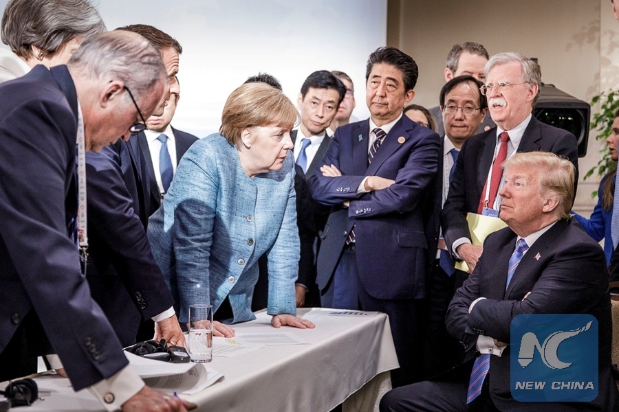 German Chancellor Angela Merkel speaks to U.S. President DonaldTrump during the second day of the G7 meeting in Charlevoix city of La Malbaie, Quebec, Canada, June 9, 2018. (Xinhua/ REUTERS)