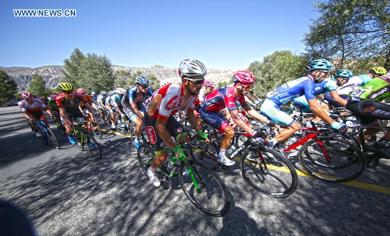 Cyclists compete in the fourth stage of the Tour of Qinghai Lake in northwest China's Qinghai Province, on July 25, 2018. (Xinhuanet Photo by Jia Haiyuan)