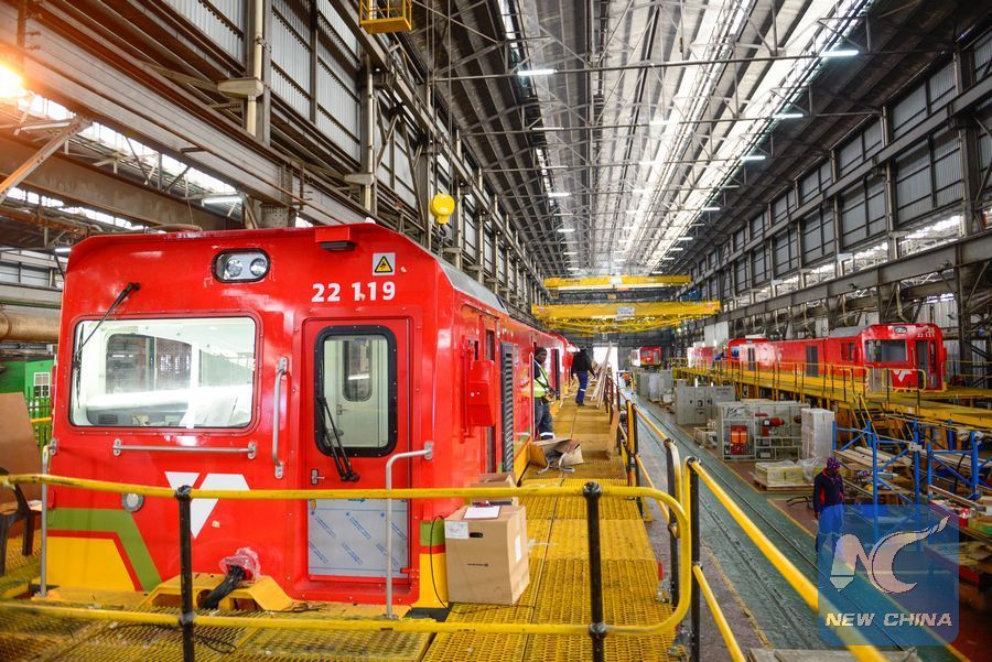 Photo taken on July 27, 2017 shows two Chinese locomotives to be assembled at the Transnet Engineering Koedoespoort Plant in Pretoria, South Africa. (Xinhua/Zhai Jianlan)