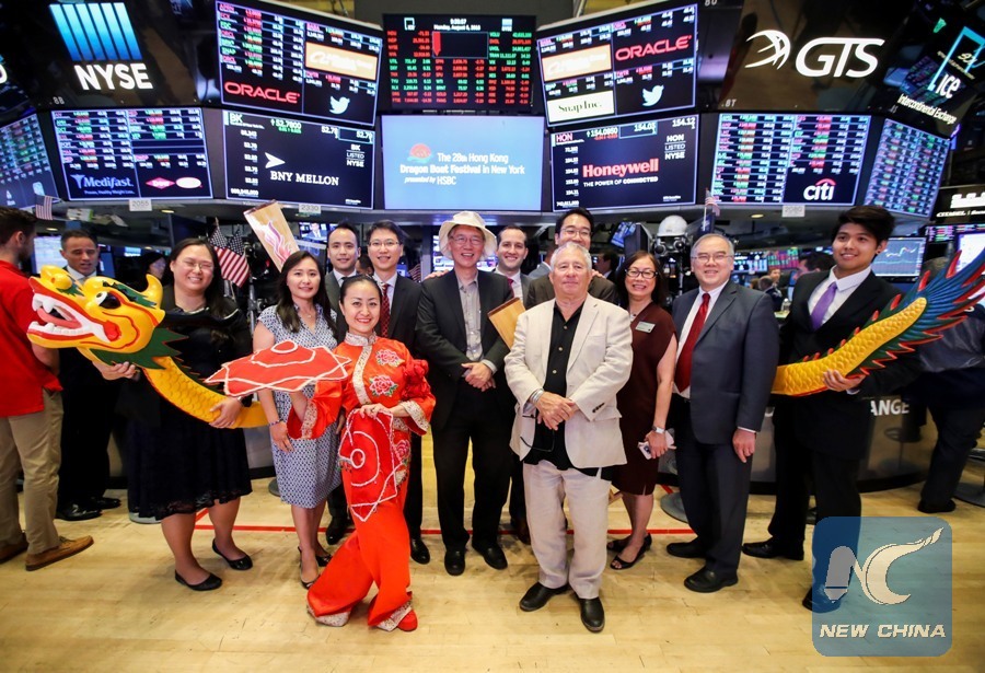 NEW YORK, Aug. 6 (Xinhua) -- Executives and sponsors of the upcoming 28th Annual Hong Kong Dragon Boat Festival rang the opening bell at the New York Stock Exchange (NYSE) on Monday in celebration of the major multi-cultural event in New York metropolitan area.