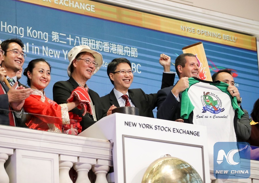 Executives and sponsors of the upcoming 28th Annual Hong Kong Dragon Boat Festival rang the opening bell at the New York Stock Exchange (NYSE) on Monday in celebration of the major multi-cultural event in New York metropolitan area. (Xinhua/Wang Ying)