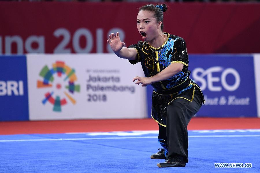 Yuen Ka Ying of China's Hong Kong competes during the Women's Nanquan & Nandao All-Round at the 18th Asian Games in Jakarta, Indonesia Aug. 19, 2018. (Xinhua/Pan Yulong)