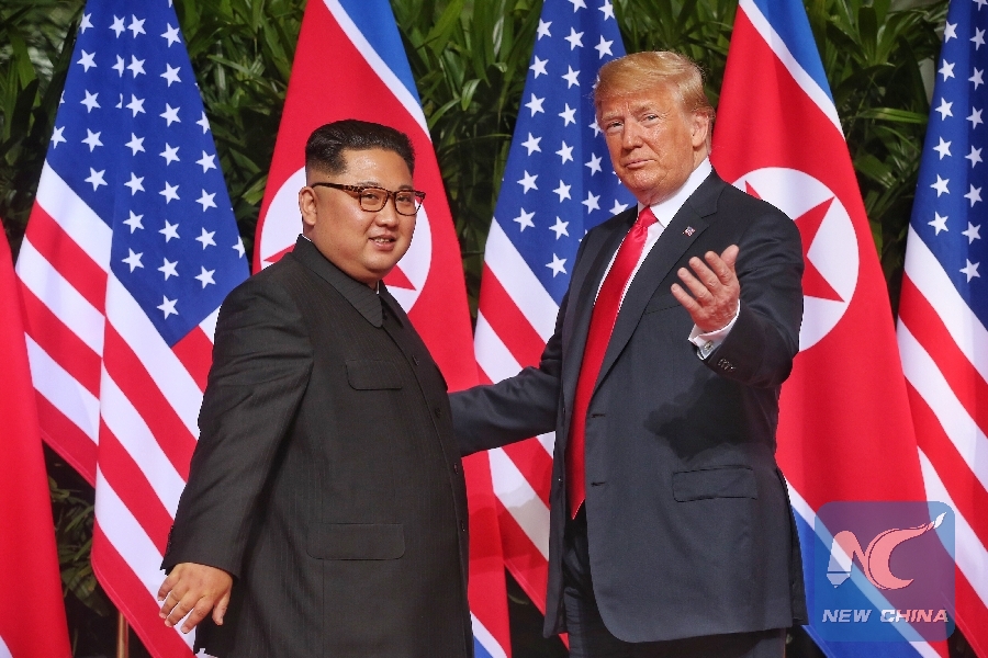 File Photo: Top leader of the Democratic People's Republic of Korea (DPRK) Kim Jong Un (L) meets with U.S. President Donald Trump in Singapore, on June 12, 2018. (Xinhua/The Straits Times)