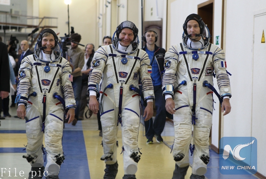 At the Gagarin Cosmonaut Training Center in Star City, Russia, Expedition 48-49 backup crewmembers Peggy Whitson of NASA (left), Oleg Novitskiy of Roscosmos (center) and Thomas Pesquet of the European Space Agency (right) arrive for Soyuz qualification exams May 26, 2016. (Xinhua photo)