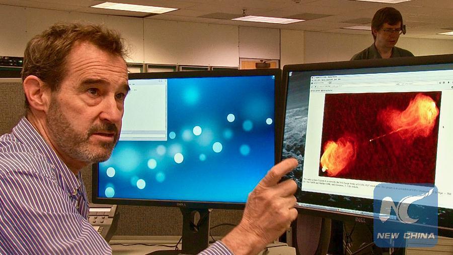 Dr. Chris Carilli, the Chief Scientist for the National Radio Astronomy Observatory explains a telescope image of explosive jets formed by matter being pulled into a black hole, in New Mexico, the United States, on Sept. 3. (Xinhua/Richard Lakin)