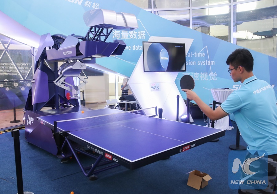 File Photo: A staff member plays table tennis with a robot during the World Artificial Intelligence Conference (WAIC) 2018 in Shanghai, east China, Sept. 17, 2018. (Xinhua/Ding Ting)