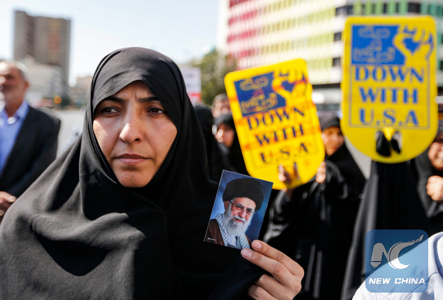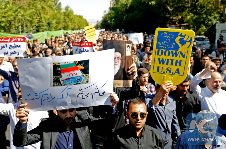 Iranians raise anti-U.S. signs and chant slogans as they march during a demonstration following the weekly Muslim Friday prayer in the capital Tehran on Sept. 28, 2018. (AFP photo)