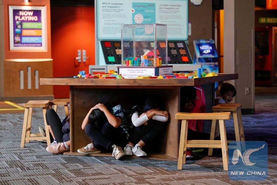 School children duck for cover under a table during the Great ShakeOut Earthquake Drill as they visit the Discovery Cube Science Center in Santa Ana, California, the United States, Oct. 18, 2018. (REUTERS Photo)