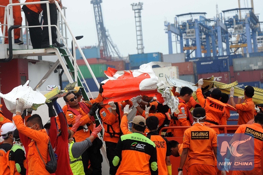 Members of the Indonesian Search and Rescue (SAR) team carry debris of Lion Air JT 610 at Tanjung Priok Port, Jakarta, Indonesia, Nov. 3, 2018. (Xinhua/Agung Kuncahya B.)