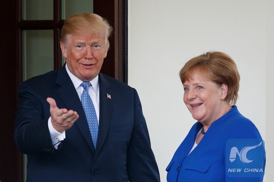 File photo shows U.S. President Donald Trump (L) welcoming German Chancellor Angela Merkel at the White House in Washington D.C., the United States, on April 27, 2018. (Xinhua/Ting Shen)