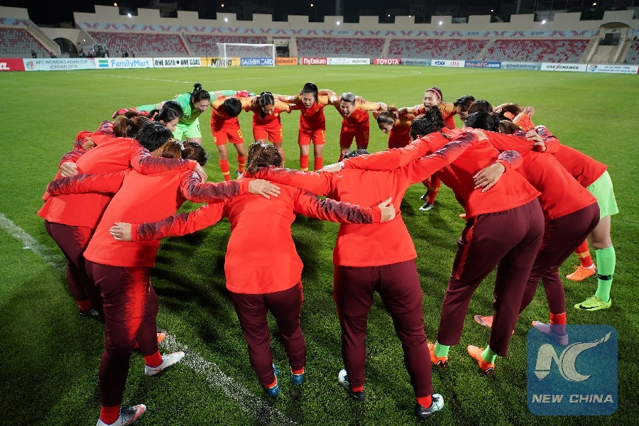Chinese women football team cheer up before the 3rd place match of 2018 AFC Women's Asian Cup in Amman, Jordan, on April 20, 2018 (Xinhua/Lin Xiaowei)