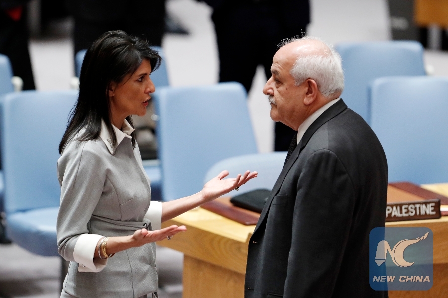 File Photo: U.S. ambassador to the United Nations Nikki Haley (L) speaks with Palestinian permanent observer to the UN Riyad Mansour prior to the UN Security Council emergency meeting on Jerusalem at the UN headquarters in New York, on Dec. 8, 2017. (Xinhua/Li Muzi)