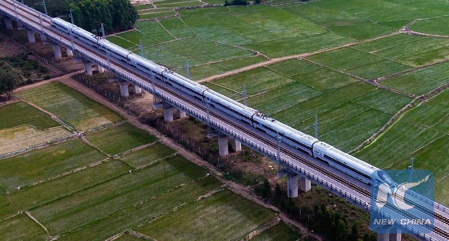Photo taken on March 7, 2018 shows a bullet train running on the western track of the high-speed loop line in Changjiang Li Autonomous County, south China's Hainan Province. (Xinhua/Yang Guanyu)