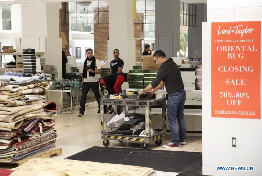 Staff members clear goods at Lord & Taylor flagship store on Fifth avenue in Manhattan, New York City, the United States, on Jan. 3, 2019. The famous department store chain Lord & Taylor officially closed its flagship store on Fifth avenue in Manhattan. The 11-storey building was a landmark on New York's most prestigious shopping area for over a century, boasting about its animated holiday windows and fine selection of jewelries and clothing and attracting city dwellers and tourists alike. (Xinhua/Wang Ying)