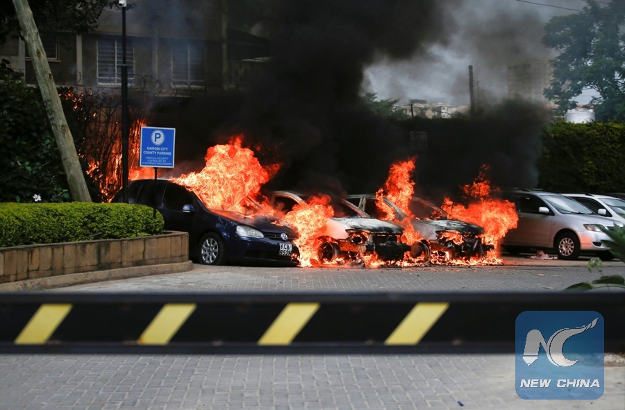 Burning cars are seen at the scene where explosions and gunshots were heard at the Dusit hotel compound, in Nairobi, Kenya, on Jan. 15, 2019. (REUTERS Photo)