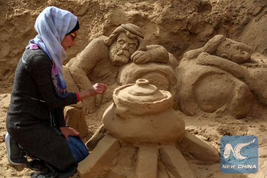 GAZA, Jan. 28 (Xinhua) -- Rana Ramlawi, a 23-year-old Palestinian young woman from the Gaza Strip, resorts to sand art to highlight the Palestinian cause and the Israeli-Palestinian conflict.