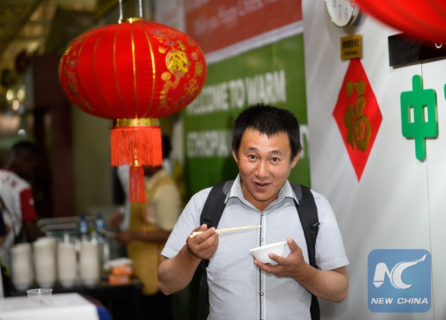 File photo shows a Chinese passenger eats dumplings during the special event held at the Bole International Airport in Addis Ababa, capital of Ethiopia, Jan. 20, 2017. (Xinhua/Michael Tewelde)