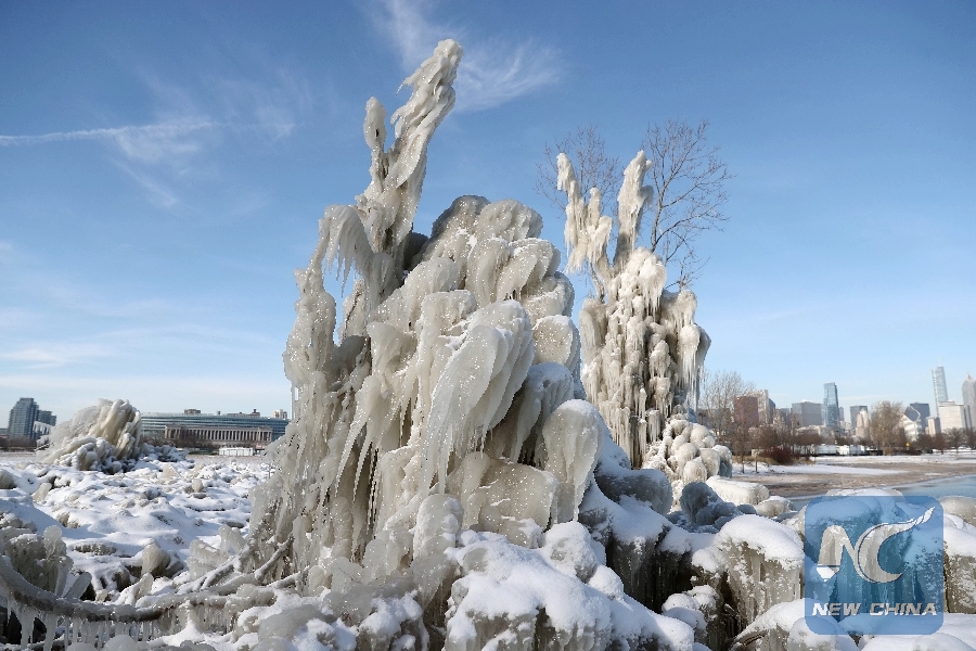 Downtown Chicago is seen through ice-covered trees in Northerly Island of Chicago, the United States, on Jan. 18, 2018. (Xinhua/Wang Ping)