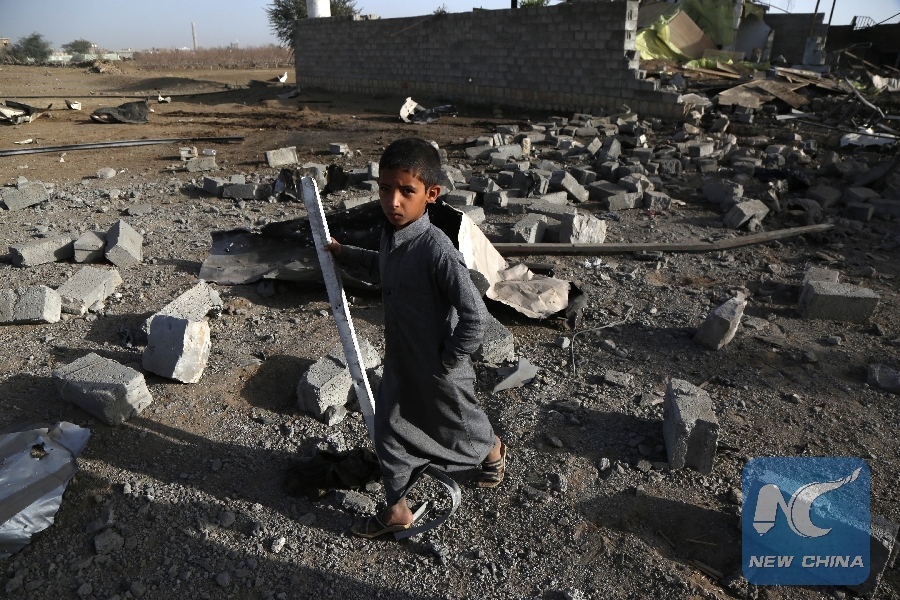 A boy walks on rubble of the site hit by airstrikes in Sanaa, Yemen, on Jan. 20, 2019. (Xinhua/Mohammed Mohammed)