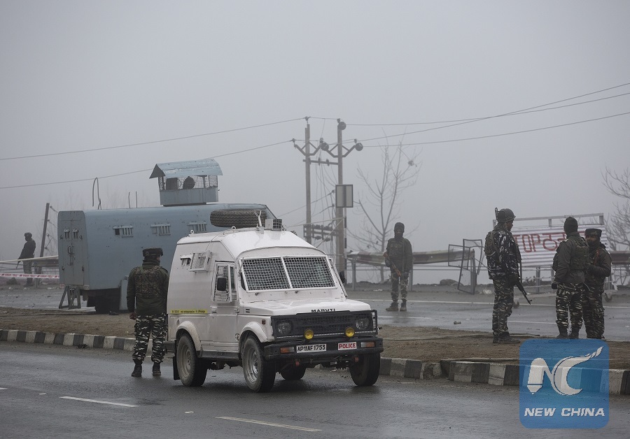 Indian paramilitary troopers stand guard as security and forensic teams inspect the wreckage of vehicles at the site of a suicide attack on a national highway near Lethpora village in Pulwama district, about 27 km south of Srinagar city, the summer capital of Indian-controlled Kashmir, Feb. 15, 2019. (Xinhua/Javed Dar)
