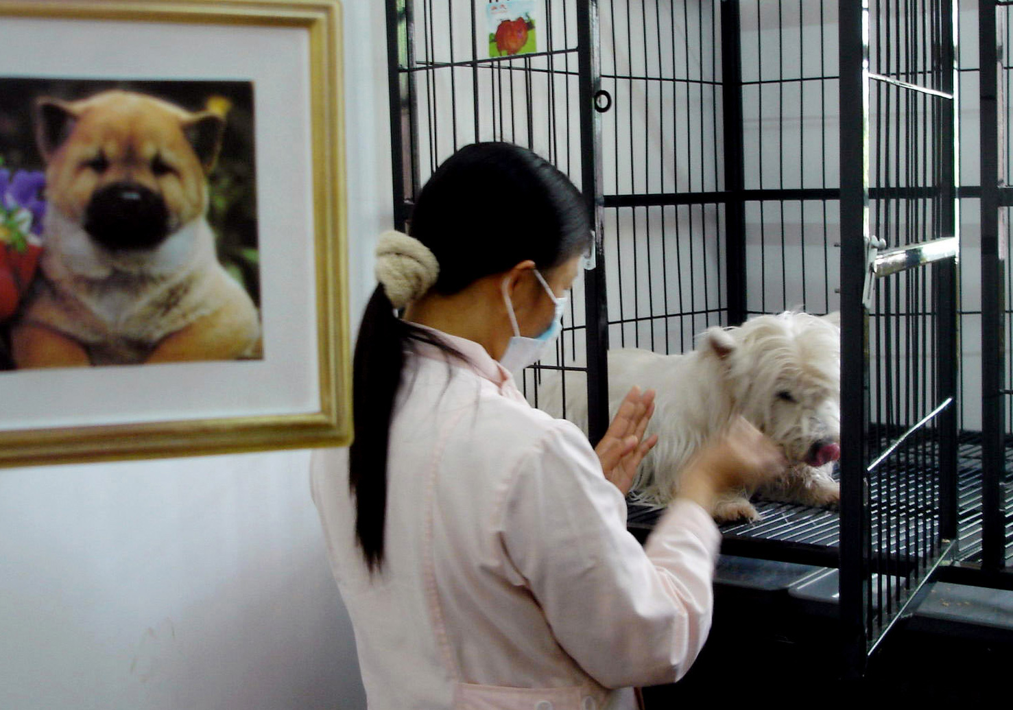 An employee of a pet hotel takes care of a dog in Suzhou, east China's Jiangsu Province. (Xinhua/Wang Jiankang)
