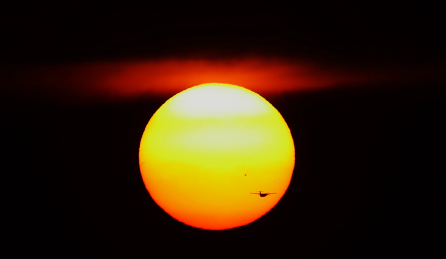 A plane flys in front of a setting sun. (Xinhua/Fei Maohua)