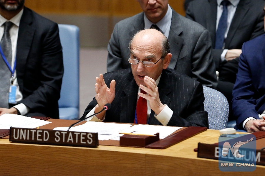 U.S. Special Representative for Venezuela Elliott Abrams (Front) addresses a United Nations Security Council meeting on the situation in Venezuela at the UN headquarters in New York, on Feb. 26, 2019. (Xinhua/Li Muzi)