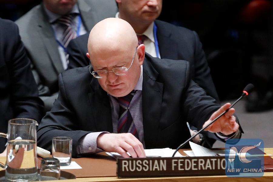 File photo taken on April 10, 2018 shows Russian Ambassador to the United Nations Vassily Nebenzia pushes the microphone away during a Security Council meeting on Syria at the UN headquarters in New York. (Xinhua/Li Muzi)