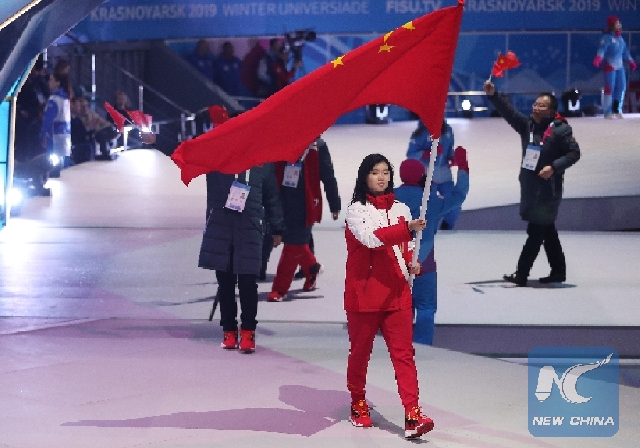 Peking University student and snowboarder Yang Shiqi bears flag for China at the Winter Universiade opening ceremony at Krasnoyarsk, Russia on March 3, 2019. (Xinhua)