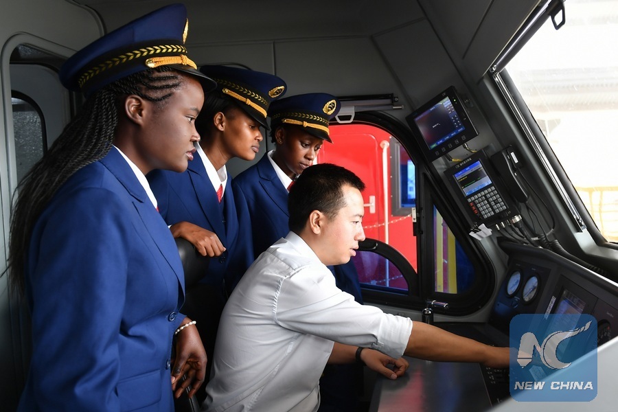 Train drivers Concilia, Wendy, Caroline (from L to R) follow the operating procedures with their Chinese instructor Zhang Cheng during training in Nairobi, Kenya, May 17, 2017, before the operation of Kenya's Mombasa-Nairobi Standard Gauge Railway (SGR). (Xinhua/Sun Ruibo)
