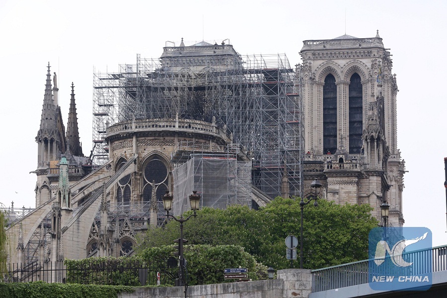 Photo taken on April 16, 2019 shows the damaged Notre Dame Cathedral after a fire in Paris, France. (Xinhua/Gao Jing)