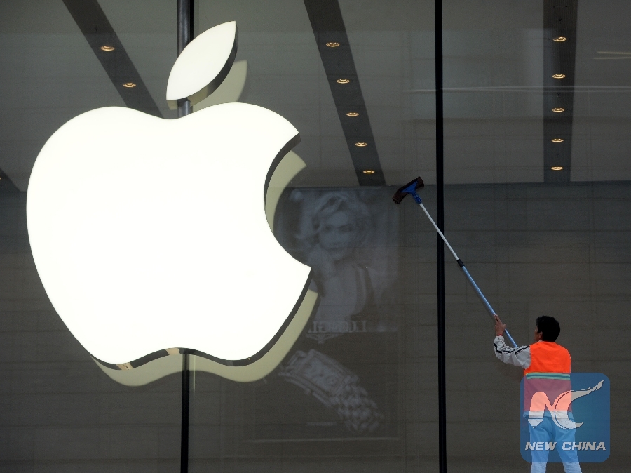 File Photo: A worker cleans the glass curtain wall outside Apple's fifth store of the Chinese mainland in Shanghai, east China, Sept. 20, 2011. (Xinhua)