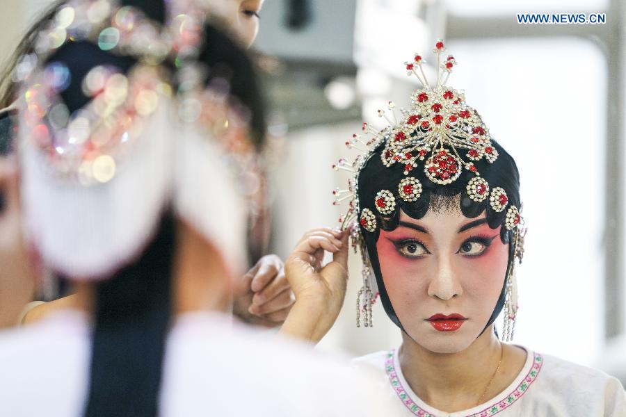 Actress He Nina arranges headwear before performing in Urumqi, capital of northwest China's Xinjiang Uygur Autonomous Region, April 24, 2019. (Xinhua/Hu Huhu)