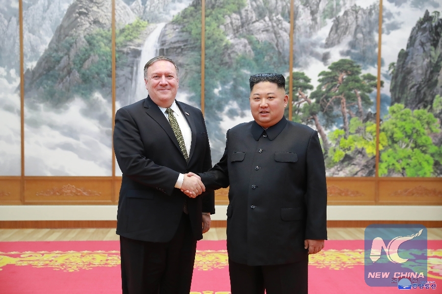 Photo provided by the Korean Central News Agency (KCNA) shows top leader of the Democratic People's Republic of Korea (DPRK) Kim Jong Un (R) shaking hands with visiting U.S. Secretary of State Mike Pompeo in Pyongyang, DPRK, Oct. 7, 2018. (Xinhua/KCNA)
