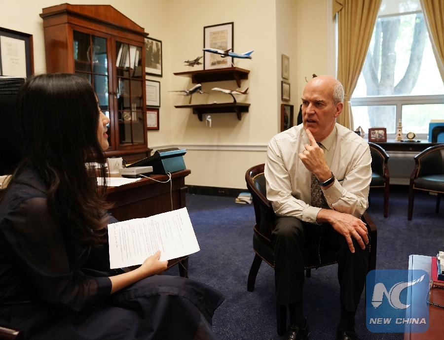 U.S. Congressman Rick Larsen (R), co-chair of the bipartisan U.S.-China Working Group in the House, speaks during an interview with Xinhua at his office in Washington D.C., the United States, May 9, 2019. (Xinhua/Liu Jie)