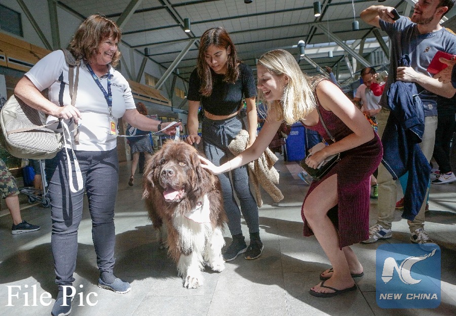 Travellers touch a therapy dog at the departure hall of Vancouver International Airport in Vancouver, Canada, on Aug. 23, 2017. (Xinhua File photo)