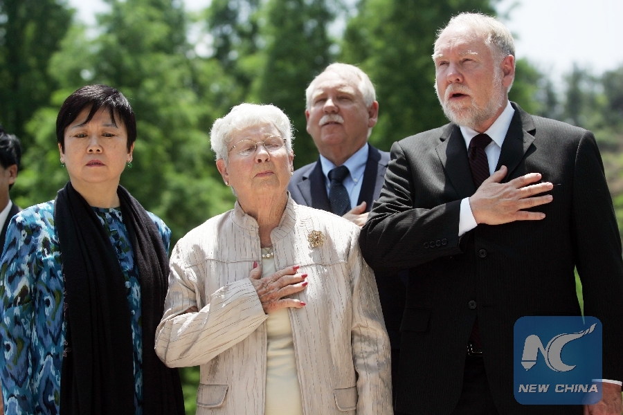 Li Xiaolin, daughter of Li Xiannian and then vice president of Chinese People's Association for Friendship with Foreign Countries, Glen Beneda's wife Elinor Beneda, son Edward Beneda and Henry Beneda (from L to R) mourn during the cremains laying ceremony of Glen Beneda, a U.S. Flying Tigers pilot during the World War II, in Hong'an County, central China's Hubei Province, on May 11, 2011. (Xinhua)